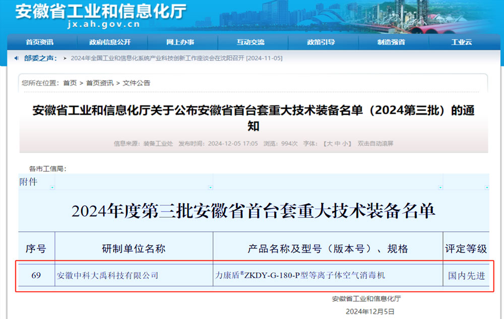• 力康盾?ZKDY-G-180-P型等離子體空氣消毒機入選2024年度第三批安徽省首臺套重大技術裝備,評定等級:國內先進